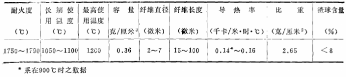 美國在三十年代研制成這種材料后,在英國、西德、日本和蘇聯(lián)也都得到了相應(yīng)的發(fā)展。美國已有60%以上的熱處理爐采用了這種材料,日本的耐火纖維年產(chǎn)量在2000噸以上,并以每年30%的速度遞增。我國有幾十個(gè)廠生產(chǎn)以焦寶石為原料的耐火纖維,大連耐火材料廠生產(chǎn)的硅酸鋁纖維的物理性能見表1、表2所示。